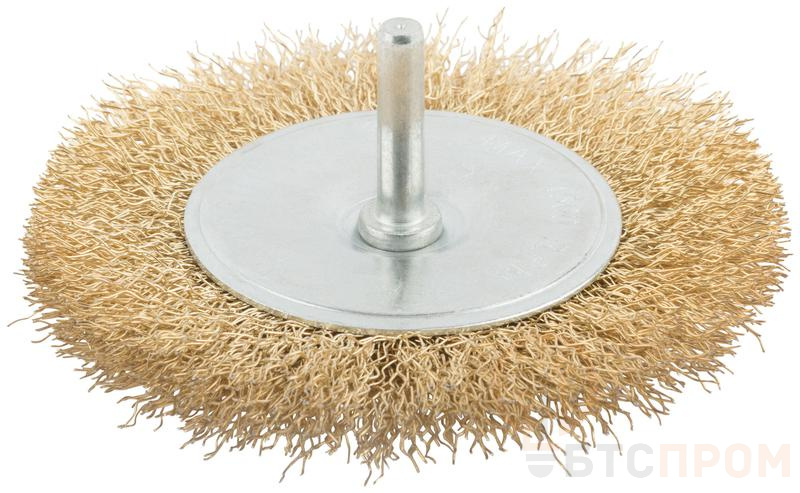 Корщетка тип "колесо" со штифтом стальная латунированная волнистая проволока 100мм MOS 38485М фото в каталоге от BTSprom.by