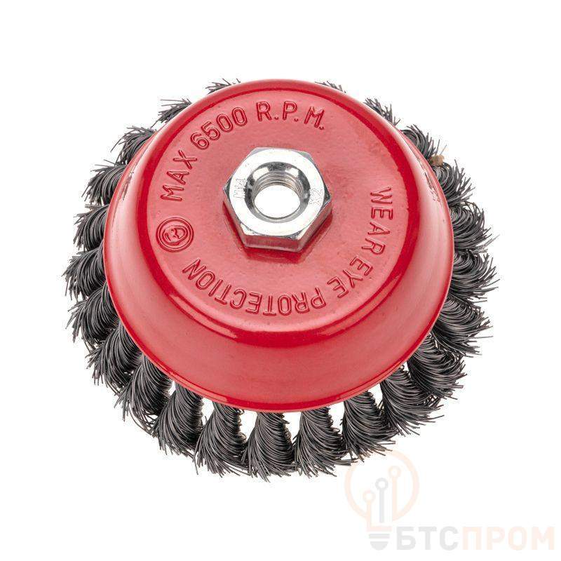Чашечная щетка KRANZ применяется в составе угловой шлифовальной машины с целью очистки разнообразных металлических деталей и заготовок от слоя краски, лака, заусенцев, ржавчины, окалины или нагара. Подходит для обработки и выравнивания сварочных швов на стальных поверхностях. Прочная закаленная проволока собрана в тугие пучки с расходящимися краями. Такой тип проволоки характеризуется жесткостью, поэтому предназначен для удаления особо сложных загрязнений. Чашечная форма позволяет обрабатывать поверхности с большой площадью, а также обеспечивает улучшенное прилегание и равномерное распределение давления при чистке. Для защиты от коррозии на корпус нанесено эмалевое покрытие, а щетина покрыта маслом. Инструмент подходит для выполнения работ, требующих значительных силовых нагрузок и продолжительного воздействия на загрязненную поверхность. Тип соединения М14 обеспечивает простоту и надежность установки на УШМ.