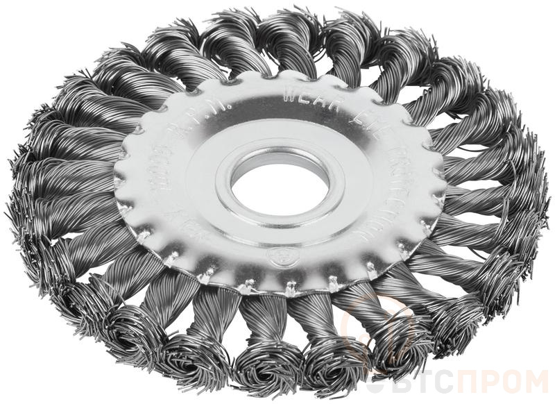 Щетка для УШМ, тип «Плоская». Предназначена для очистки различных металлических и деревянных поверхностей, снятия ржавчины, удаления лакокрасочных покрытий и других загрязнений. Тип «Плоская» оптимально подходит для обработки углов, пазов, изгибов и других труднодоступных участков. Грубая зачистка, стальная проволока 0,5 мм. Упаковка: блистер.