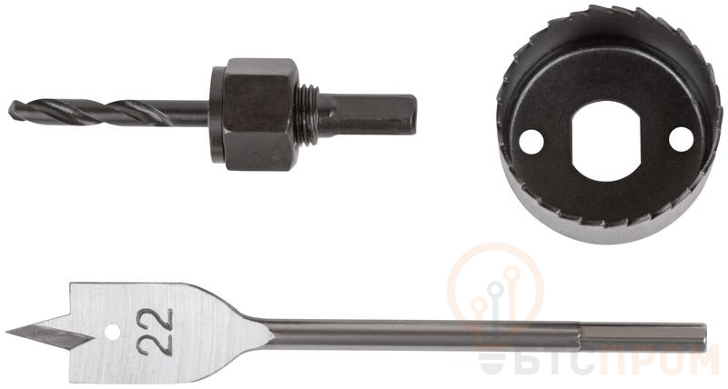 Набор для врезки замков КУРС предназначен для работ по дереву, фанере, ДСП. В наборе представлены все необходимые инструменты для быстрой установки замка: коронка, направляющее сверло, перовое сверло. Центрирующее сверло обеспечивает точное позиционирование коронки, исключая ее смещение во время работы. Разводка зубьев на коронке обеспечивает высокую скорость пропила. Шестигранный хвостовик на адаптере и перовом сверле предотвращает проскальзывание в патроне электроинструмента.