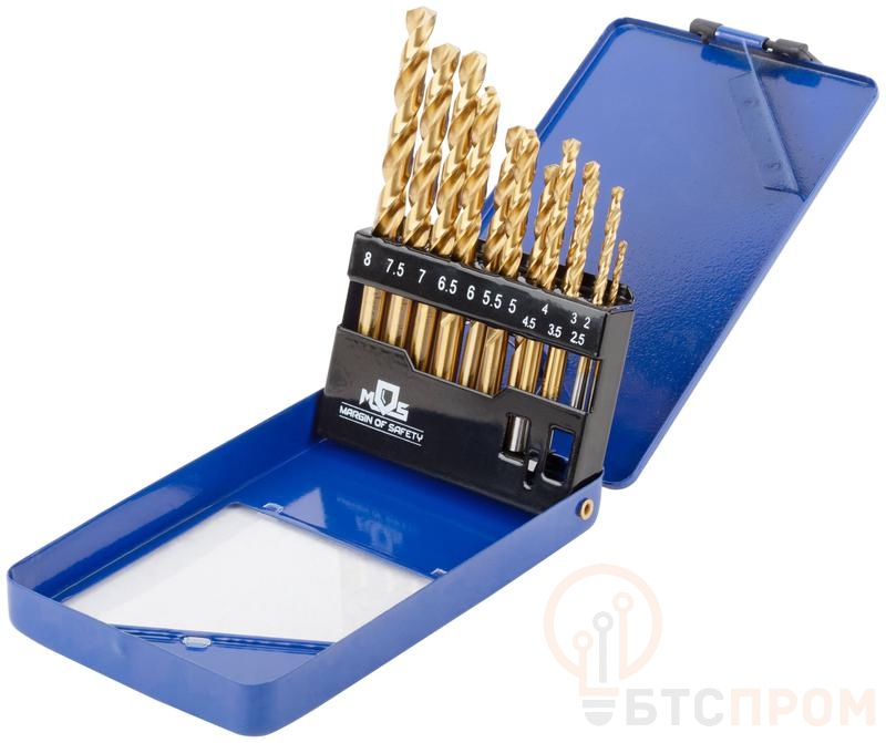 Набор сверл по металлу HSS шлифованные титановое покрытие угол заточки 135град. мет. бокс 13шт (2-2.5-3-3.5-4-4.5-5-5.5-6-6.5-7-7.5-8мм) MOS 35743М