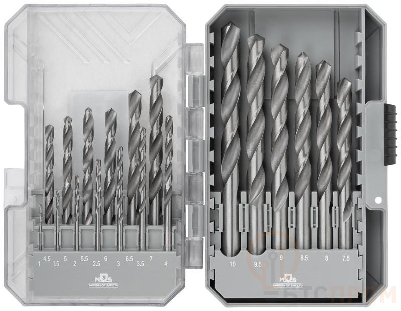 Набор сверл по металлу MOS предназначен для сверления стали, чугуна, тонкого алюминия, пластика. Сверла изготовлены из быстрорежущей стали марки HSS4241 методом продольно винтового проката с углом заточки 118 градусов. Соответствуют ГОСТу 10902-77 и европейскому стандарту DIN338. Цилиндрический хвостовик совместим с большинством типов патронов электроинструментов. 19 сверл разных размеров в комплекте обеспечивают широкий спектр применения.