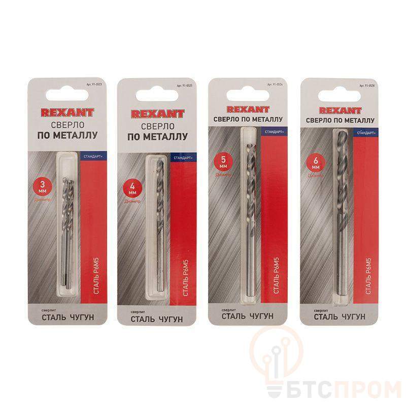 Набор REXANT состоит из 4 сверл по металлу диаметром 3, 4, 5, 6 мм, предназначенных для обработки металлов с твердостью 900-1100 МPa (легированная и нелегированная сталь, стальное литье, серый чугун, ковкий чугун, металлокерамика, цветные металлы, твердые пластмассы). Сверла, входящие в состав набора, произведены по стандарту DIN338 из быстрорежущей стали М2 (аналог P6M5) твердостью 63 HRC. Праворежущее спиральное сверло с углом заточки 135° подходит для более твердых материалов и обеспечивает увеличение производительности на 40 % по сравнению с углом 118°. Крестообразная подточка в сочетании позволяет начинать сверление без накернивания. При сверлении обязательно использование смазочно-охлаждающей жидкости (СОЖ).