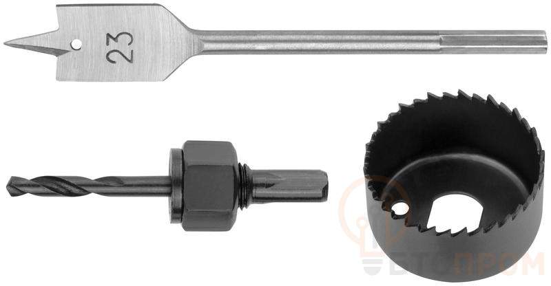 Набор для врезки замков FIT IT предназначен для работ по дереву, фанере, ДСП. В наборе представлены все необходимые инструменты для быстрой установки замка: коронка, направляющее сверло, перовое сверло. Центрирующее сверло обеспечивает точное позиционирование коронки, исключая ее смещение во время работы. Разводка зубьев на коронке обеспечивает высокую скорость пропила. Шестигранный хвостовик на адаптере и перовом сверле предотвращает проскальзывание в патроне электроинструмента.
