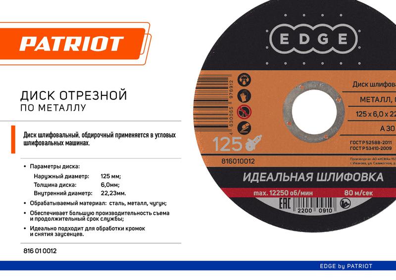 Диск абразивный шлифовальный 125х6.0х22.23 по металлу (Россия) PATRIOT 816010012 фото в каталоге от BTSprom.by