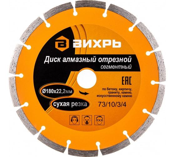 Диск алмазный отрезной сегментный 180х22.2ммсухая резка Вихрь 73/10/3/4