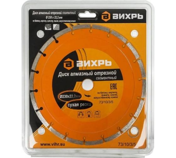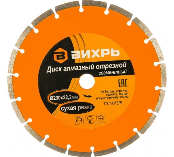 Алмазный отрезной диск Вихрь 230х22.2 мм предназначен для высокоэффективной сухой резки различных строительных материалов. Специальная сегментная конструкция диска обеспечивает оптимальное охлаждение во время работы и предотвращает перегрев.