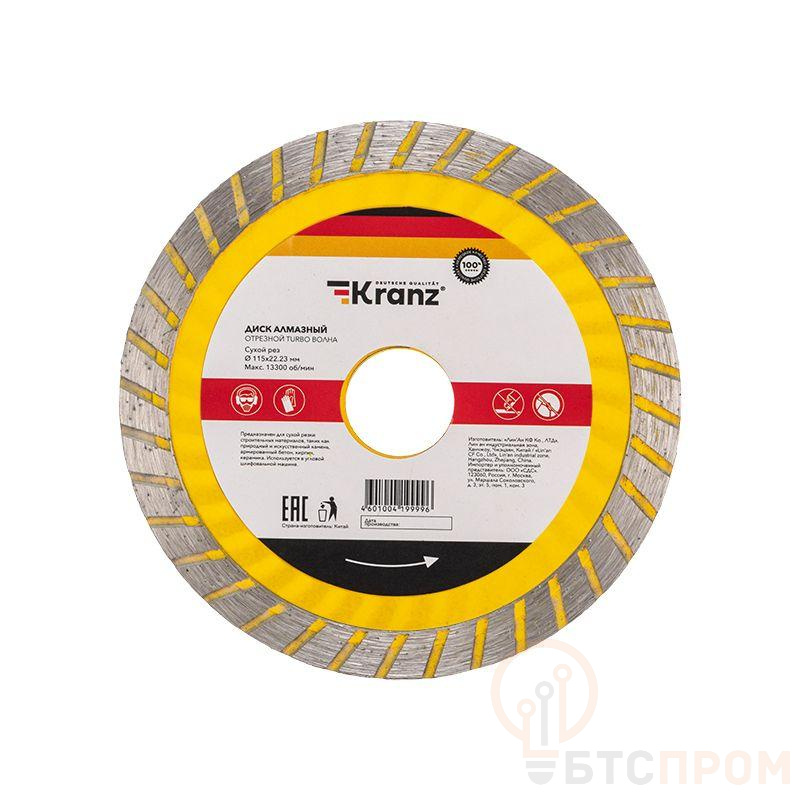 Диск алмазный отрезной Turbo волна применяется для сухой и влажной резки строительных материалов, таких как природный и искусственный камень, армированный и неармированный бетон, кирпич, керамика и керамогранит. Применяется совместно с в угловыми шлифовальными машинами, ручными электрическими плиткорезами, штроборезами. Благодаря специальной конструкции Turbo волны диск обладает более высокой скоростью резки и улучшенным охлаждением. За счет особой усиленной конструкции тела диска способен выдерживать более интенсивные нагрузки. Диск состоит из стального корпуса и алмазного рабочего слоя с высотой кромки 10 мм, что обеспечивает эффективную резку материала и долгий срок службы самого диска. Процесс резки сопровождается воздушным охлаждением за счет турбированной формы алмазного слоя. Это позволяет пилить без водяного охлаждения. Срок годности не ограничен. Хранить в сухом прохладном месте. Использовать строго по назначению. Внимание! Запрещается использовать диск для разрезания металлов. При установке диска руководствуйтесь стрелкой направления вращения диска. Используйте средства индивидуальной защиты. Не утилизируйте с бытовыми отходами.