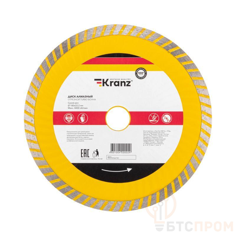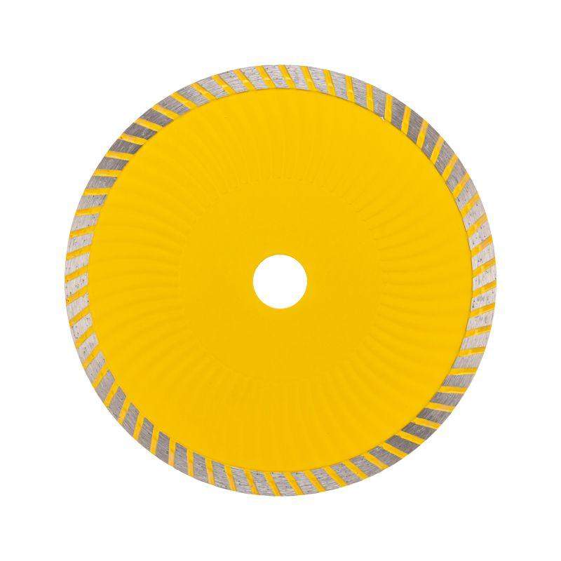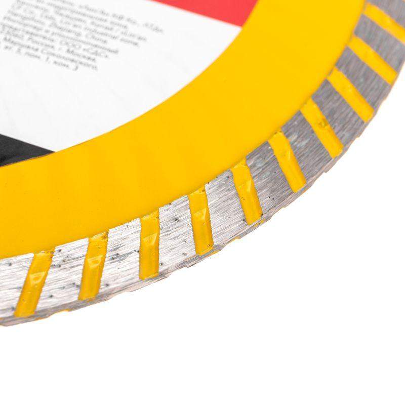 Диск алмазный отрезной Turbo волна применяется для сухой и влажной резки строительных материалов, таких как природный и искусственный камень, армированный и неармированный бетон, кирпич, керамика и керамогранит. Применяется совместно с в угловыми шлифовальными машинами, ручными электрическими плиткорезами, штроборезами. Благодаря специальной конструкции Turbo волны диск обладает более высокой скоростью резки и улучшенным охлаждением. За счет особой усиленной конструкции тела диска способен выдерживать более интенсивные нагрузки. Диск состоит из стального корпуса и алмазного рабочего слоя с высотой кромки 10 мм, что обеспечивает эффективную резку материала и долгий срок службы самого диска. Процесс резки сопровождается воздушным охлаждением за счет турбированной формы алмазного слоя. Это позволяет пилить без водяного охлаждения. Срок годности не ограничен. Хранить в сухом прохладном месте. Использовать строго по назначению. Внимание! Запрещается использовать диск для разрезания металлов. При установке диска руководствуйтесь стрелкой направления вращения диска. Используйте средства индивидуальной защиты. Не утилизируйте с бытовыми отходами.