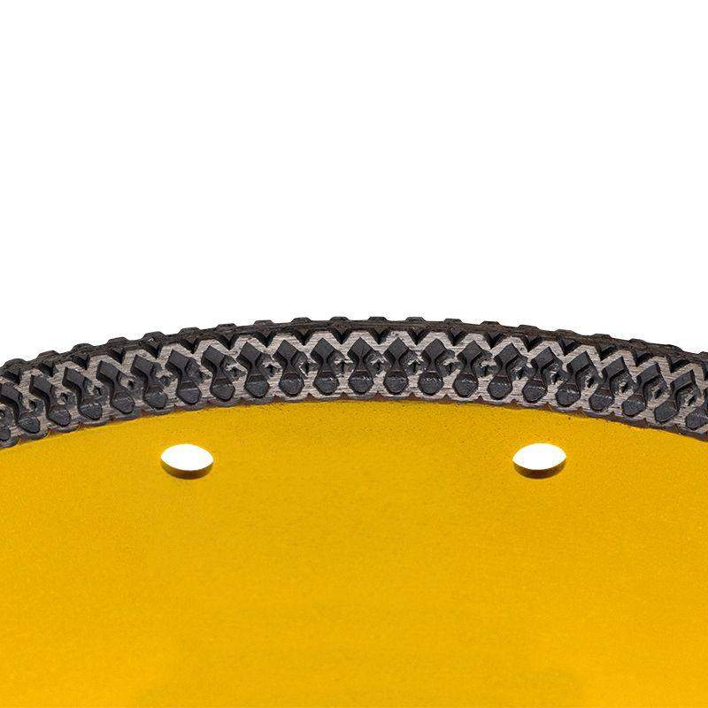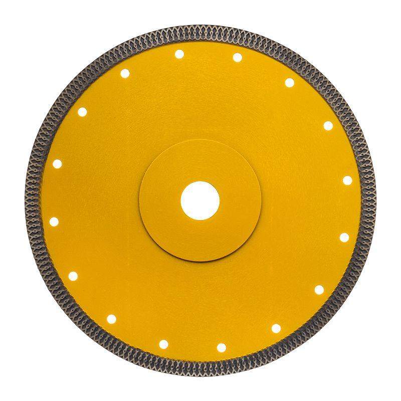 Диск алмазный отрезной ультратонкий предназначен для использования с угловыми шлифовальными машинами (УШМ) и ручными электрическими плиткорезами. Применяется для сухой и мокрой резки строительных материалов, таких как гранит, керамогранит, песчаник, клинкер, мрамор, керамика. Диск изготовлен из инструментальной стали и обладает ультратонким лезвием, покрытым синтетическим алмазом с высотой кромки 10 мм, что обеспечивает точную и чистую резку и долгий срок службы самого диска. Процесс резки сопровождается воздушным охлаждением за счет особой формы алмазного слоя. Это позволяет пилить без водяного охлаждения. Срок годности не ограничен. Хранить в сухом прохладном месте. Использовать строго по назначению. Внимание! Запрещается использовать диск для разрезания металлов. При установке диска руководствуйтесь стрелкой направления вращения диска. Используйте средства индивидуальной защиты. Не утилизируйте с бытовыми отходами.