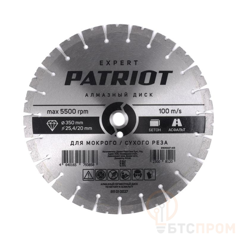 –Диск EXPERT алмазный сегментный 350х25.4/20 бетон/асфальт PATRIOT 811010027