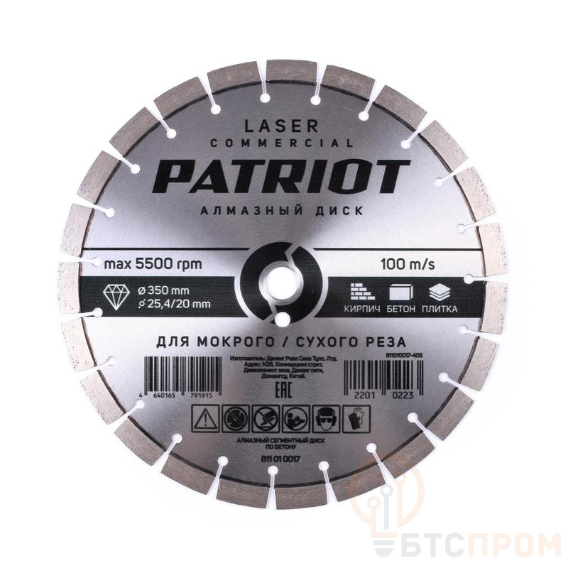 –Диск LASER COMMERCIAL алмазный сегментный 350х25.4/20 по бетону PATRIOT 811010017