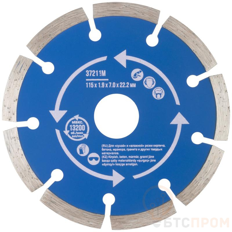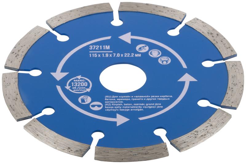 Сегментный. Для использования с УШМ . Посадочный диаметр 22,2мм. Для "сухой" и "влажной"резки кирпича, бетона, мрамора,гранита и других твердых материалов. Сегментная режущая кромка обеспечивает охлаждение диска в процессе работы, предотвращая его перегрев. Материал: инструментальная сталь, режущая кромка-расплав с техническими алмазами. Уп: Блистер