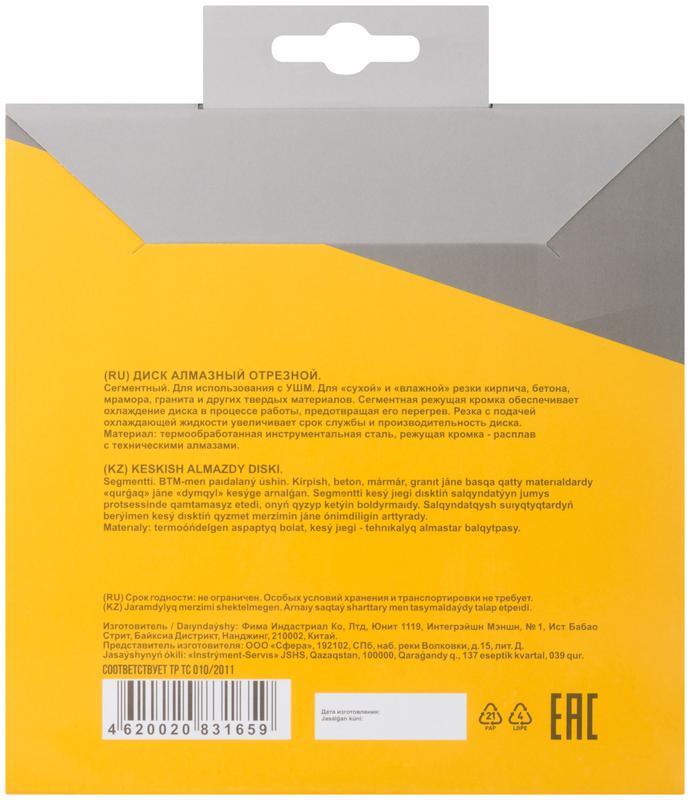 Сегментный. Для использования с УШМ . Посадочный диаметр 22,2мм. Для "сухой" и "влажной"резки кирпича, бетона, мрамора,гранита и других твердых материалов. Сегментная режущая кромка обеспечивает охлаждение диска в процессе работы, предотвращая его перегрев. Материал: инструментальная сталь, режущая кромка-расплав с техническими алмазами. Уп: Блистер