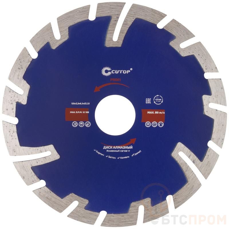 Отрезной алмазный диск ‘’усиленный сегмент’’ Cutop Profi предназначен для сухой и влажной резки камня, гранита, бетона, кирпича. Предназначен для профессионального использования. Изготовлен из инструментальной стали. Режущая кромка содержит порошок из качественных синтетических алмазов.