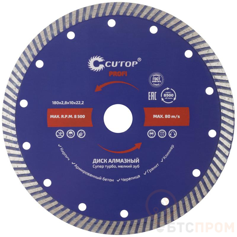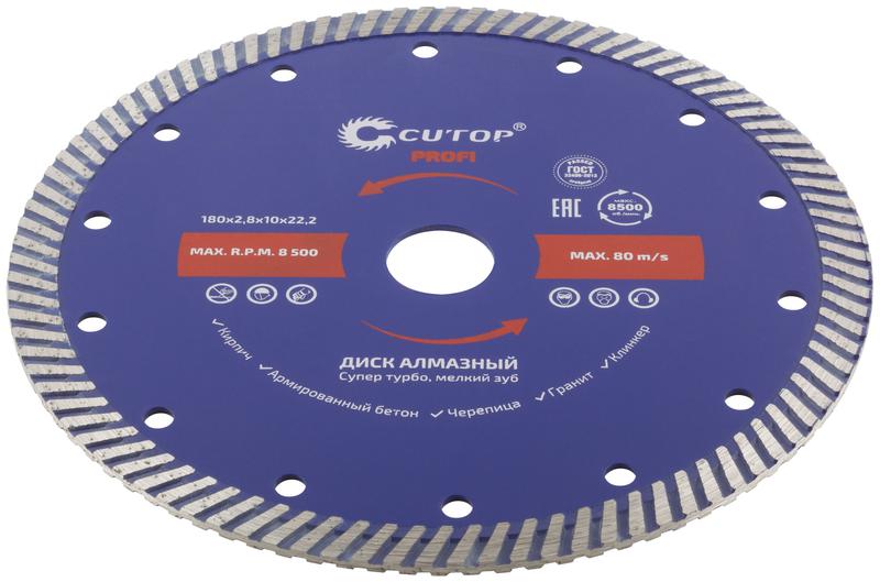 Отрезной алмазный диск ‘’супертурбо, мелкий зуб’’ Cutop Profi применяется для сухой и влажной резки армированного бетона, гранита, кирпича, камня и других строительных материалов. Предназначен для профессионального использования. Изготовлен из инструментальной стали. Режущая кромка содержит порошок из качественных синтетических алмазов. Турбированная поверхность обеспечивает эффективный выброс продуктов резания при обработке.