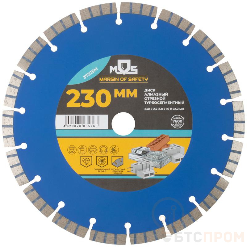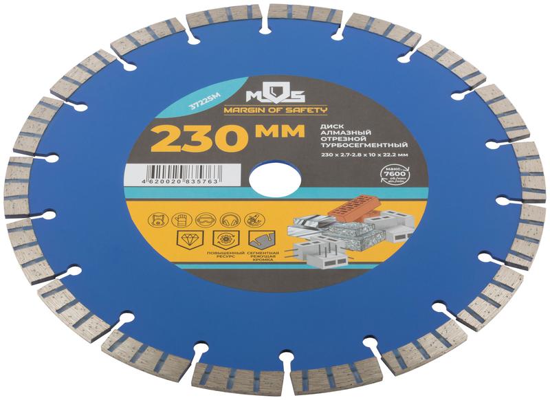 Диск отрезной алмазный турбо-сегментный MOS предназначен для сухой и влажной резки кирпича, армированного бетона, мрамора, гранита и других твердых материалов. Для использования с УШМ. Сегментная алмазная режущая кромка, с турбопрофилем высотой 10 мм увеличивает скорость реза и способствует более эффективному удалению отработанного материала, предотвращая перегрев диска.