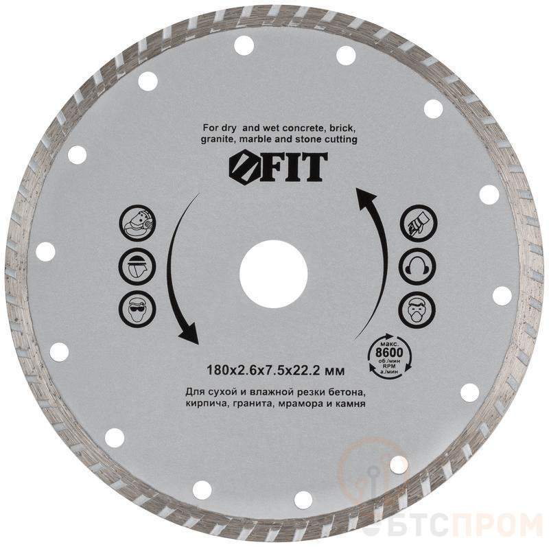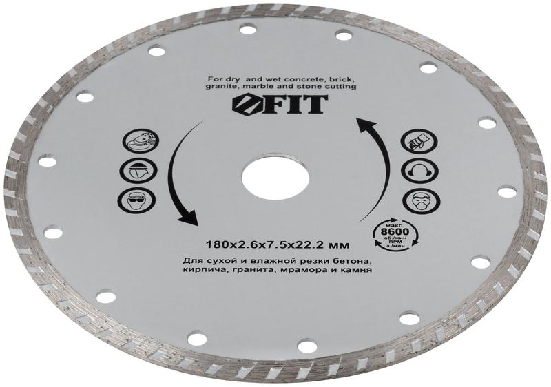 Диск отрезной алмазный «Турбо» FIT IT предназначен для сухой и влажной резки кирпича, армированного бетона, мрамора, гранита и других твердых материалов. Для использования с УШМ. Высокий рабочий ресурс дисков достигается за счет повышенной концентрации алмазного зерна в режущей кромке. Специальный турбопрофиль режущей кромки увеличивает скорость реза и способствует более эффективному удалению отработанного материала, предотвращая перегрев диска.