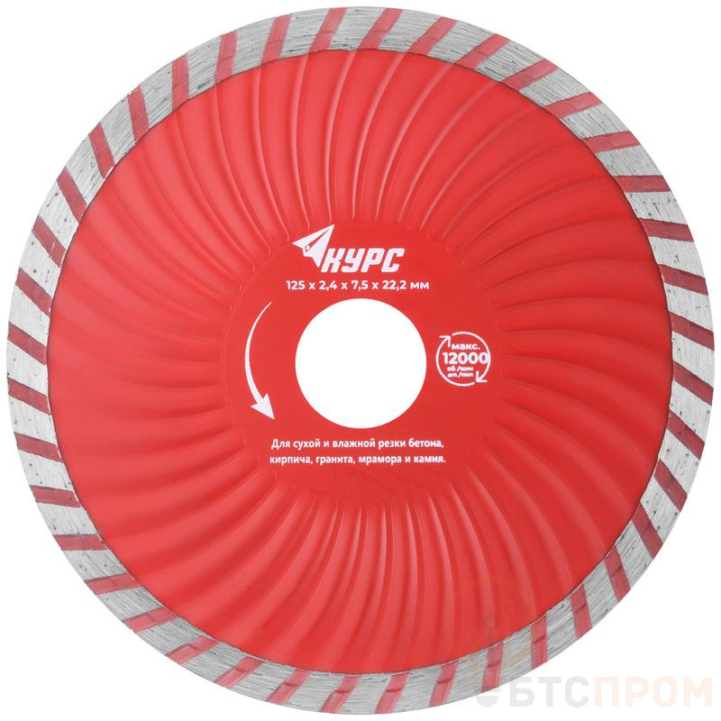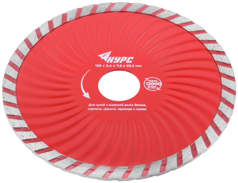 Диск отрезной алмазный «Турбо-волна» КУРС с усиленной конструкции предназначен для сухой и влажной резки кирпича, армированного бетона, мрамора, гранита и других твердых материалов. Для использования с УШМ. Сегментная алмазная режущая кромка с турбопрофилем высотой 7,5 мм увеличивает скорость реза и способствует более эффективному удалению отработанного материала, предотвращая перегрев диска.