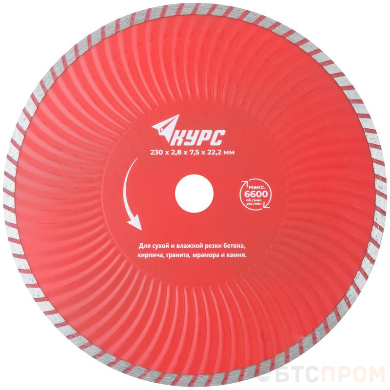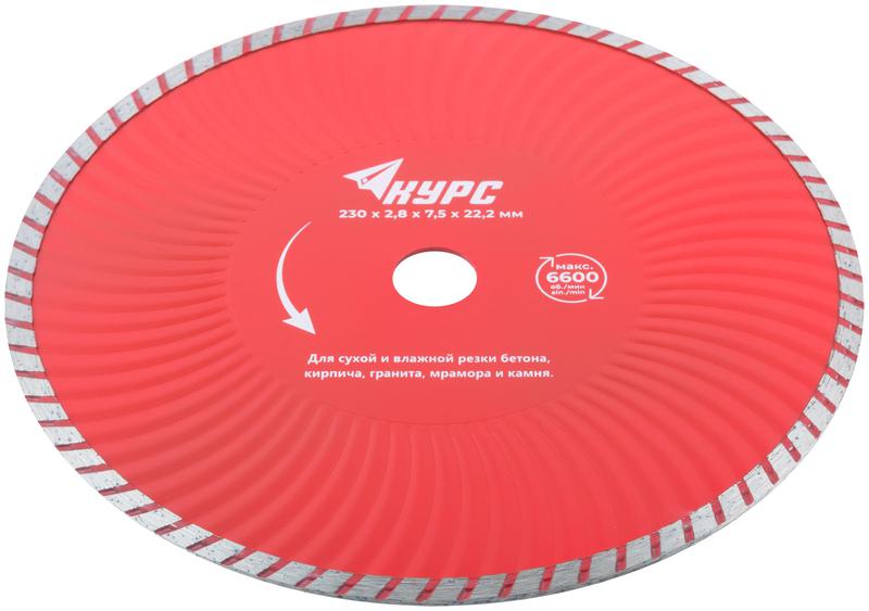Диск отрезной алмазный «Турбо-волна» КУРС с усиленной конструкции предназначен для сухой и влажной резки кирпича, армированного бетона, мрамора, гранита и других твердых материалов. Для использования с УШМ. Сегментная алмазная режущая кромка с турбопрофилем высотой 7,5 мм увеличивает скорость реза и способствует более эффективному удалению отработанного материала, предотвращая перегрев диска.
