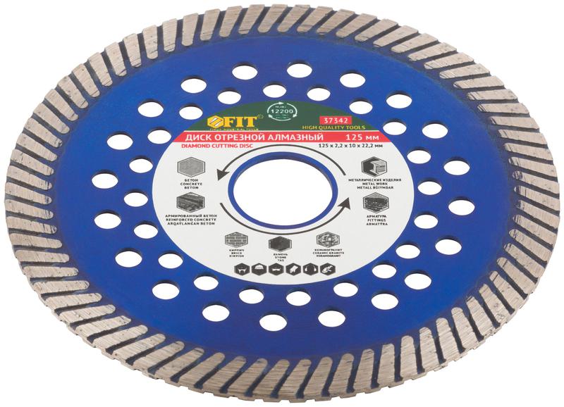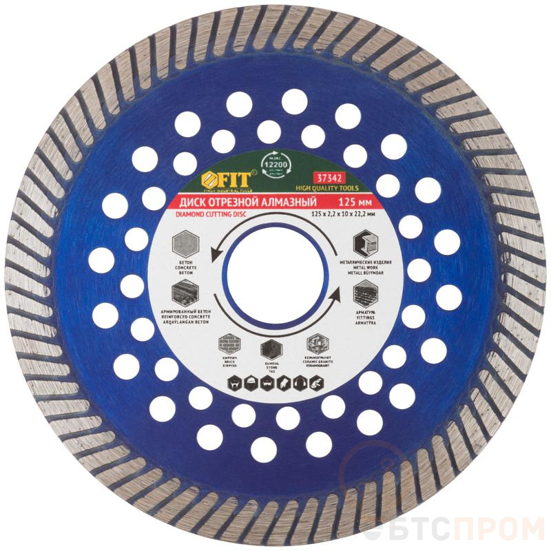 Диск алмазный отрезной «Армобетон Профи» FIT HQ применяется для сухой и влажной резки бетона, кирпича, гранита, керамогранита, мрамора и камня. Диск изготовлен по технологии горячего спекания, обеспечивающего высокую износоустойчивость. Специально подобранные компоненты металлической связки и размер алмазного зерна позволяют эффективно резать широкий спектр твердых материалов, в частности армированный бетон, арматуру и металлический профиль. Высокий ресурс диска достигается за счет высоты алмазной кромки в 10 мм. Диск не уменьшается в диаметре при резке различных материалов. Перфорация на диске и сегментная форма рабочей части обеспечивают эффективное охлаждение и предотвращают деформацию во время работы. Диски способны эффективно работать без принудительного охлаждения водой.