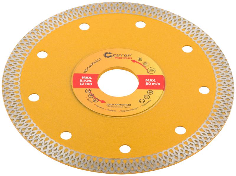 Отрезной алмазный диск ‘’универсальный турбо’’ Cutop Profi Plus предназначен для сухой и влажной резки керамической плитки. Применяется с УШМ и стационарными плиткорезами. Режущая кромка обеспечивает высокую скорость резки и аккуратный точный распил плитки без трещин и сколов. Высокая концентрация алмазов мелкой фракции обеспечивает идеальную чистоту получаемых кромок. Диск изготовлен методом горячего прессования, что обеспечивает большую твердость и более длительный срок службы диска по сравнению с дисками, изготовленными методом холодного прессования. Высота алмазного режущего слоя в 10 мм позволяет использовать круг для большого объема работ. Специальная форма режущей кромки обеспечивает охлаждение круга во время работы для большей эффективности использования.