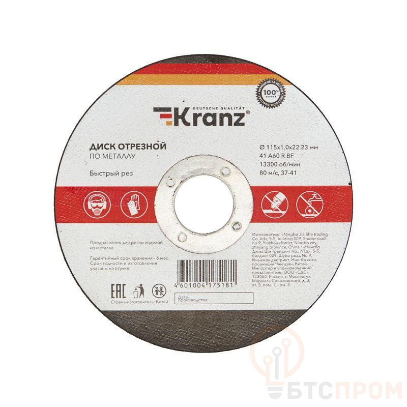 Отрезной диск KRANZ используется для обрезки и обработки тонкостенных металлических изделий, таких как листы, трубы, профили, проволока и т.д. Диск совместим с большинством угловых шлифмашин (УШМ), которые имеют стандартный диаметр посадочного отверстия (22,23 мм). Отрезной круг изготовлен на бакелитовой основе (BF), что обеспечивает гибкость и устойчивость к изломам. Благодаря двойной армированной стеклосетке достигается усиленная боковая нагрузка 40 Н, что гарантирует повышенную безопасность для пользователя. Абразивное зерно из электрокерамического корунда (А) обеспечивает износостойкость и высокую производительность. Диск следует применять строго по назначению, а также соблюдать технику безопасности и использовать средства индивидуальной защиты.