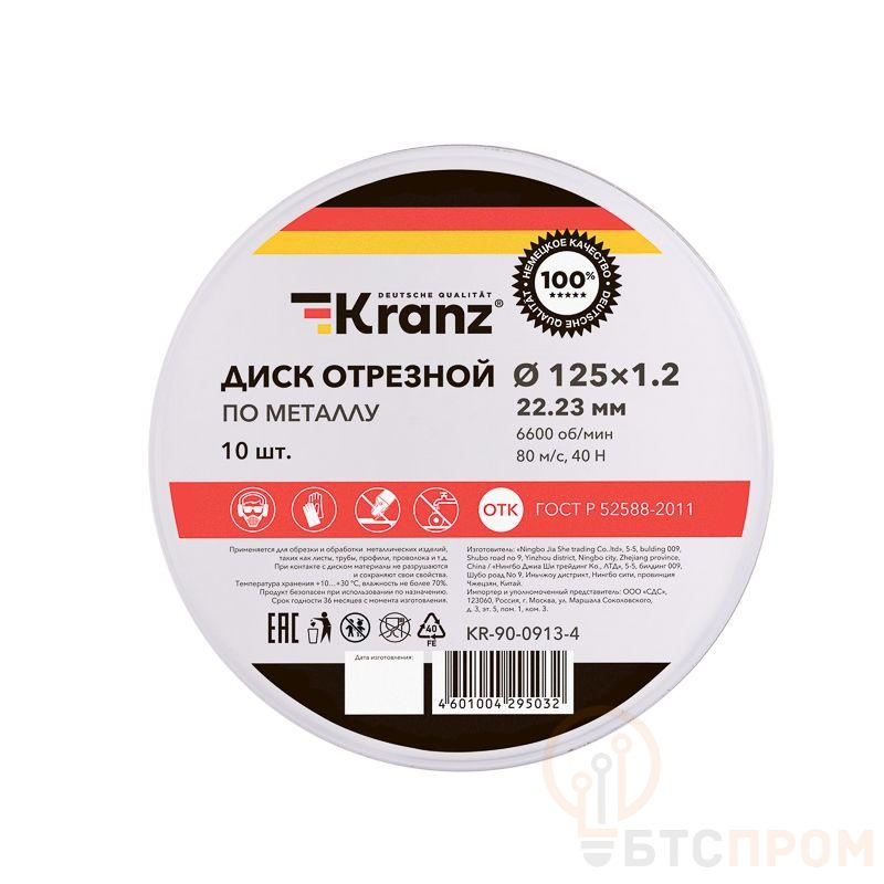 Диск отрезной по металлу 125х1.2х22.23мм метал. бокс (уп.10шт) Kranz KR-90-0913-4 фото в каталоге от BTSprom.by