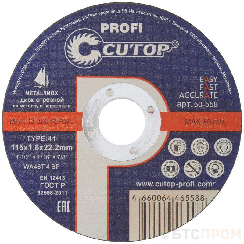 Диск отрезной по металлу и нерж. стали Profi Т41-115х1.6х22.2мм Cutop 50-558 фото в каталоге от BTSprom.by