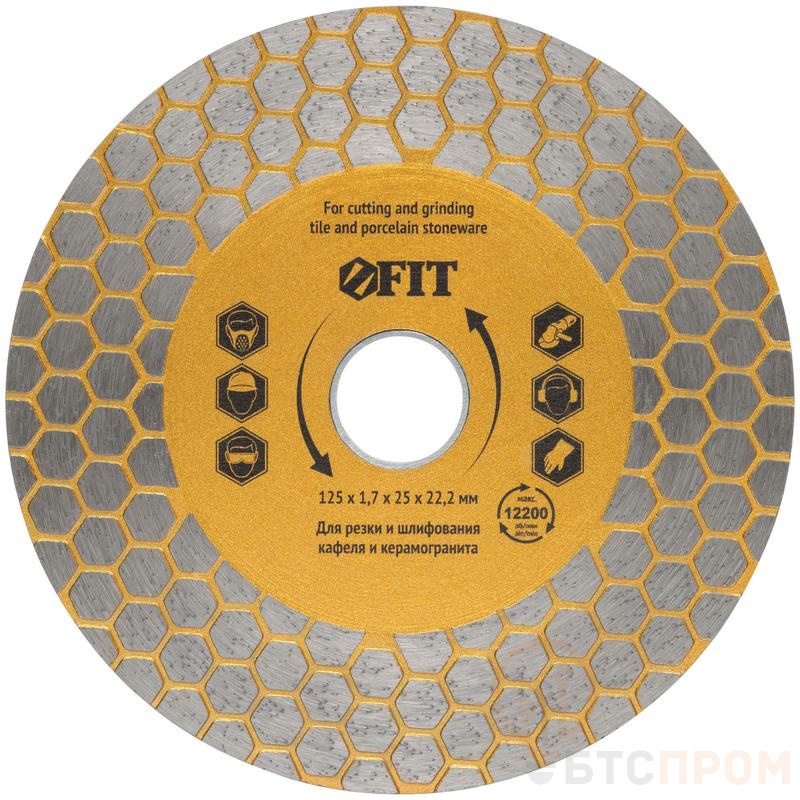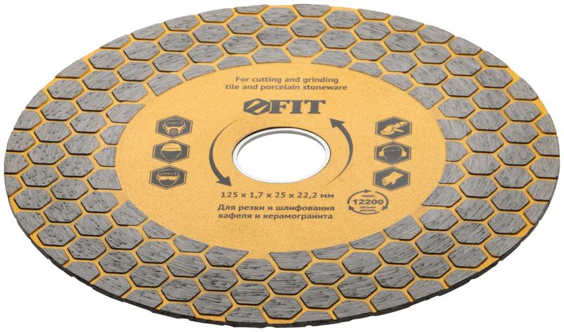 Диск алмазный отрезной FIT HQ предназначен для сухой и влажной резки кафеля и керамогранита. Используется с УШМ. Благодаря высокой режущей кромке диск также способен шлифовать камень и керамогранит. Изготовлен по технологии горячего спекания. Можно работать без принудительного охлаждения. Высота режущей кромки 25 мм дает возможность шлифовки материала. Оптимален для заусовки плитки под углом 45 градусов. Рабочая форма в виде сот обеспечивает эффективное охлаждение. Технология горячего спекания и повышенная концентрация алмазов увеличивают прочность диска и его износостойкость. Мелкозернистый алмазный порошок способствует чистому резу без сколов.