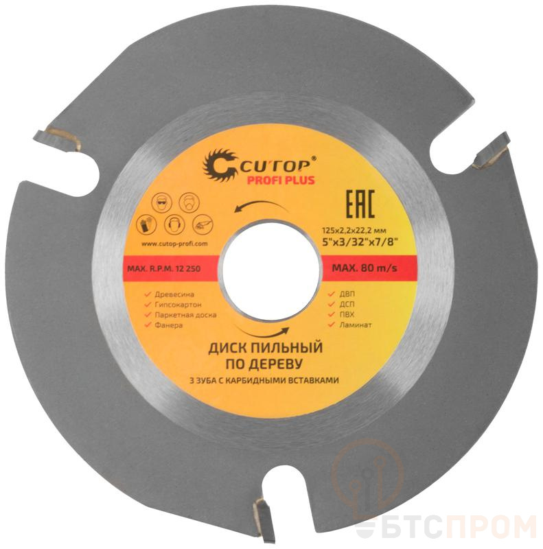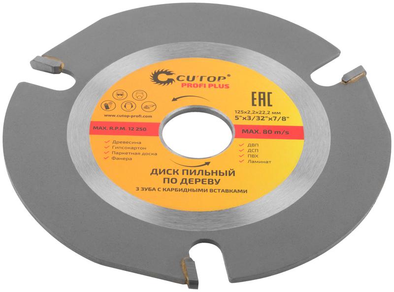 Диск пильный Cutop Profi Plus предназначен для использования совместно с УШМ и применяется для чистого и ровного реза древесины, гипсокартона, паркетных досок, фанеры, ДВП, ДСП, ПВХ, ламината. Диск имеет 3 твердосплавные напайки из карбида вольфрама, что обеспечивает: безопасность при высоких оборотах., устойчивость к деформации и воздействию температур. Материал: инструментальная сталь, зубья из карбида вольфрама. Упаковка: блистер.