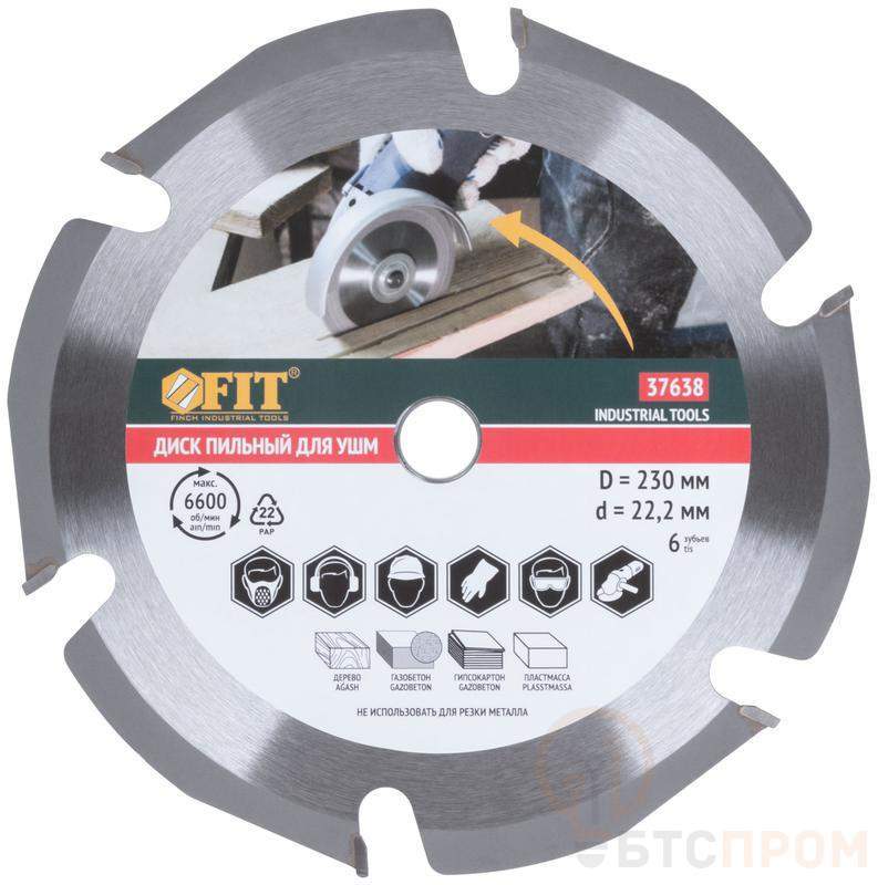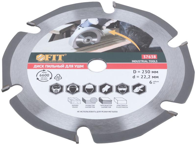 Пильный диск FIT IT для УШМ с шестью зубьями предназначен для обработки дерева, газобетона, пластмассы. Специальная форма диска препятствует его застреванию в материале. Карбидные напайки обеспечивают качественный, быстрый и чистый рез. Диск подходит для работ с различными породами древесины, справляясь как с мягкими, так и с твердыми сортами.