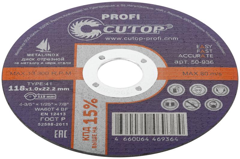 Диск отрезной по металлу и нержавеющей стали Cutop Profi используется с УШМ для резки сталей и различных сплавов. Предназначен для профессионального применения. Диск изготовлен на основе монокристаллического электрокорунда, который улучшает КПД диска и позволяет увеличить количество резов в несколько раз.