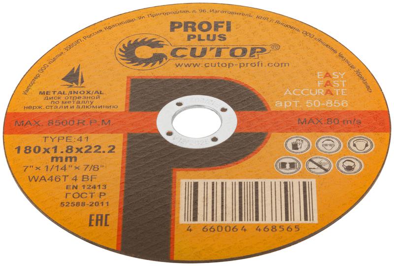Диск отрезной по металлу нерж. стали и алюм. профессиональный Profi Plus Т41-180х1.8х22.2мм Cutop 50-856