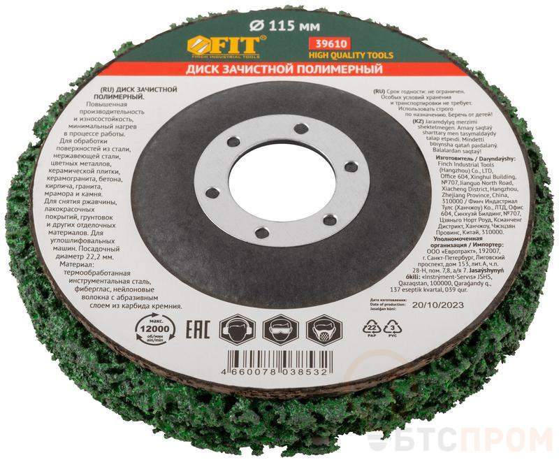 Диск зачистной полимерный FIT HQ предназначен для очистки гладких металлических поверхностей от ржавчины и краски. Используется с УШМ. Благодаря специальной структуре диски гораздо меньше загрязняются и нагреваются при работе по сравнению с привычным абразивным инструментом. После снятия покрытия не так сильно заглубляются в материал зачищаемой поверхности. Быстро снимают краску и ржавчину с поверхности. Не размазывают краску по поверхности. Оставляют после себя гладкую поверхность. Внимание! Для наилучшего результата и продления срока службы оснастки крайне важно соблюдать следующие условия работы: держать обороты не выше 4500 в минуту; работать с минимальным прижимом; стараться избегать углов, отверстий, выступов.