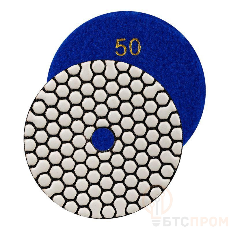 Алмазный гибкий шлифовальный круг KRANZ предназначен для сухого шлифования поверхностей из камня, мрамора, гранита и керамогранита. Конструкция «черепашка» с открытыми сегментами способствует эффективному отводу шлама, что позволяет работать без охлаждающей жидкости. Абразив с зернистостью P50 используется для черновой обработки: равномерно снимает большой слой материала. Рабочая поверхность содержит высокую концентрацию алмазов, а прочная связка из термопластика придает стойкость к нагреву и продлевает срок службы. Гибкая форма позволяет использовать инструмент для шлифовки изделий сложной формы. Липучка позволяет быстро и надежно зафиксировать круг на опорной тарелке. Круг устанавливается на УШМ с опорной тарелкой для алмазных гибких шлифовальных кругов (АГШК).