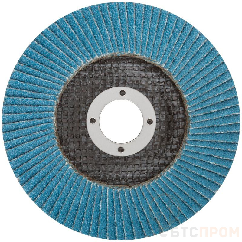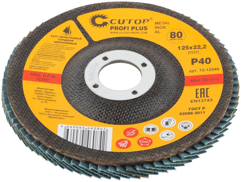 Круг наждачный лепестковый Cutop Profi Plus предназначен для обработки нержавеющей стали, металла, сварных швов, пластика, дерева. Для углошлифовальных машин. При изготовлении кругов используется высококачественный гибкий абразивный материал, состоящий из тканевой основы, на которую нанесен слой циркониевого электрокорунда. Круги на основе циркониевого электрокорунда имеют высокую прочность, коэффициент шлифования на кругах данного типа выше в несколько раз, чем у кругов на основе нормального электрокорунда, что особенно эффективно при работе с особо твёрдыми сортами металла. Структура циркониевого электрокорунда даёт эффект самозатачивания, что также увеличивает ресурс использования. Наполняемость диска составляет 80 лепестков с углом наклона 10 градусов, это позволяет увеличить КПД круга и его стойкость к износу в несколько раз.