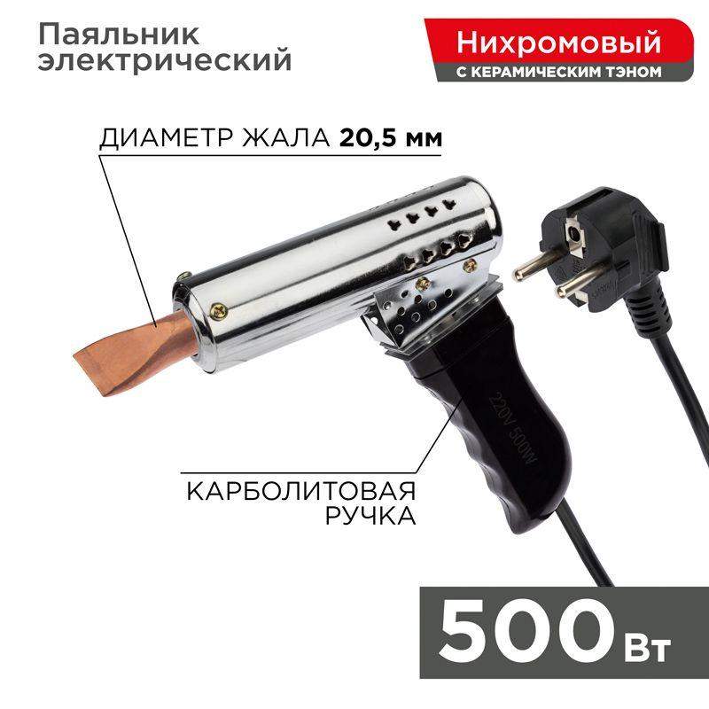 Паяльник-пистолет высокомощный, серия ЭПСН, мощность 500 Вт REXANT. Предназначен для ручной пайки металлических изделий или листов средней и более толщины, а также для лужения крупных проводов или кабельных наконечников. Подходит как для любительского, так и для профессионального использования. Нагреватель оснащен керамической трубкой, что обеспечивает быстрый прогрев жала, увеличивает энергоэффективность паяльника и продлевает его срок службы. Медное жало выполнено в форме клина (лопатки), в случае необходимости его можно легко и быстро заменить (сменное жало в комплект не входит). Эргономичная рукоятка, выполненная из карболита, сделает работу с инструментом удобной.