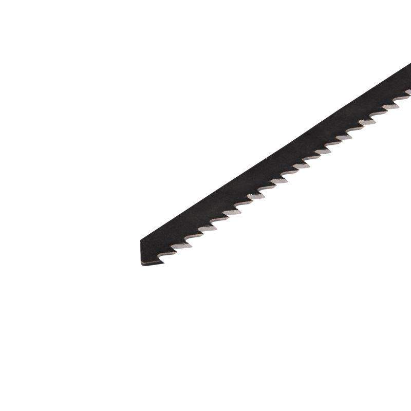 Полотно для электролобзика предназначено для быстрого распила дерева, фанеры толщиной от 8 до 100 мм. Подходит как для бытового, так и для профессионального применения, будет полезно при проведении столярных, ремонтных и строительных работ. Полотно пилки выполнено из высокоуглеродистой стали, поэтому отличается прочностью и долговечностью. Режущая кромка состоит из зубьев с шагом 4,2 мм и рассчитана на получение быстрого распила. Улучшенная закалка токами высокой частоты увеличивает твердость зубьев и обеспечивает высокий ресурс. Универсальный Т-образный хвостовик подходит для установки на большинство моделей электролобзиков. Комплект состоит из двух полотен и рассчитан на выполнение большого объема работ.