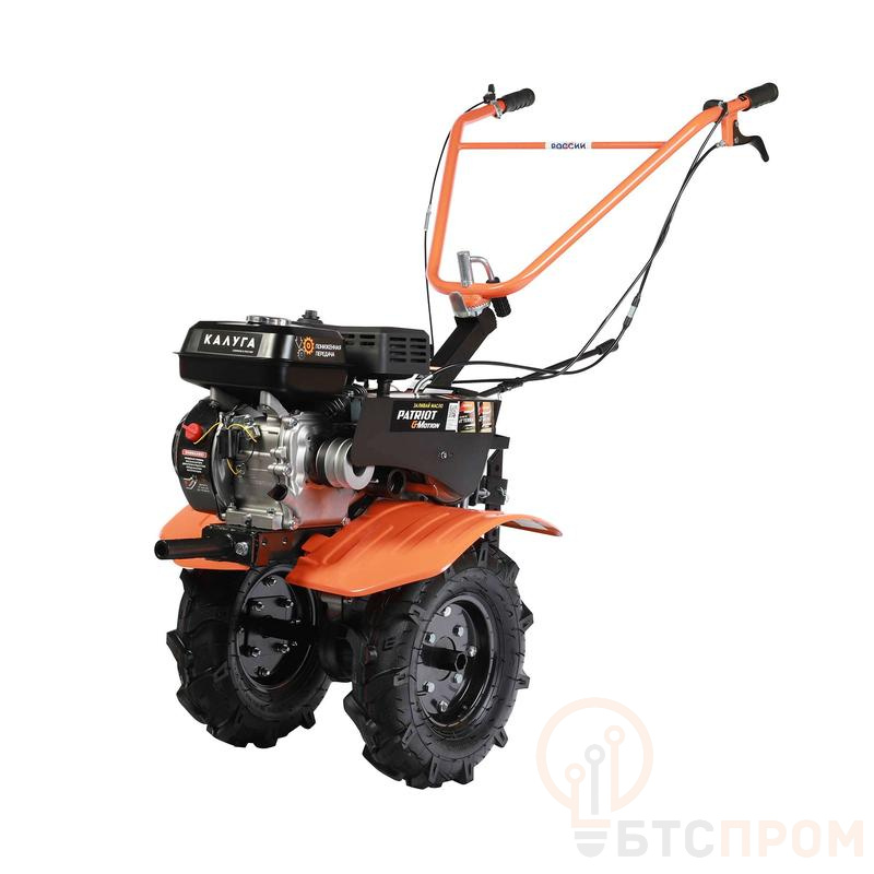 Мотоблок Patriot Калуга предназначен для возделывания больших земельных участков. Благодаря двигателю мощностью 7 л.с. он вспахивает полосу земли шириной 90 см на глубину до 30 см. Благодаря наличию 4 скоростей вперед и 2 назад вам будет удобно выбрать нужный темп работы. Чтобы расширить сферу применения, можно дополнительно приобрести плуг, окучник, снежный отвал и другое навесное оборудование.Бензиновый мотоблок PATRIOT КАЛУГА пониженная передача, 4 вперед/2 назад используется для возделывания почвы на сельскохозяйственных участках. Большие пневматические колеса с агрессивным протектором гарантируют хорошую проходимость по бездорожью. Резиновые накладки на рукоятках гарантируют удобное удержание агрегата без скольжения руки. Пониженная первая передача увеличивает проходимость машины на сложных участках. Данный мотоблок имеет 4 передачи вперед и 2 передачи назад. Переключение передачи происходит как с помощью рычага (1,2 вперед, R назад), так и с помощью переброски ремня с большей проточки шкива на меньшую.