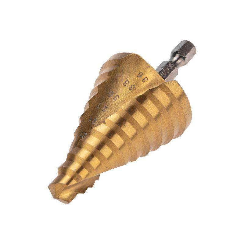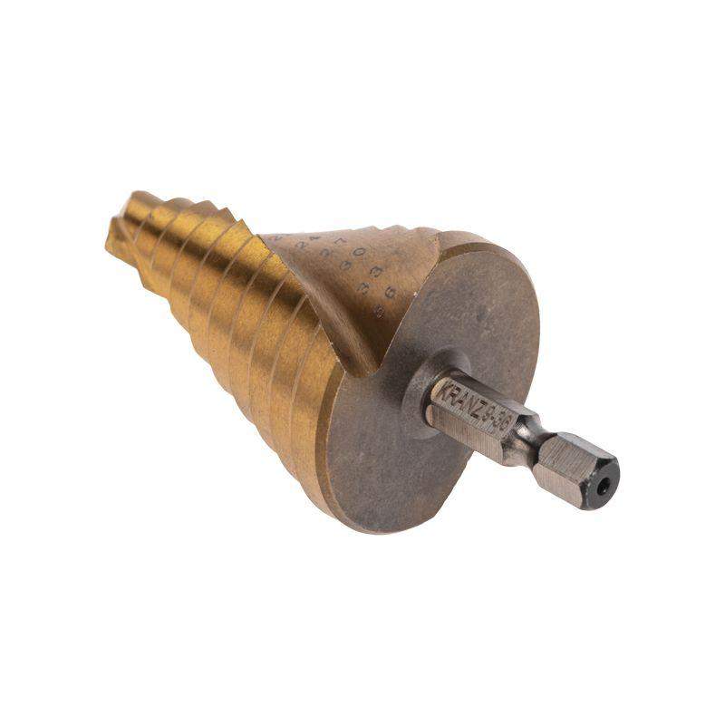 Ступенчатое сверло KRANZ применяется при выполнении монтажно-сборочных работ для сверления отверстий различных диаметров без перестановки режущего инструмента. Применяется в работе с такими материалами, как пластик, дерево, металл и др. Благодаря своей уникальной конструкции изделие заменяет целый набор традиционных спиральных сверл. Использование оснастки позволяет сэкономить время мастера, так как не требует предварительного кернения и сверления. Шестигранный хвостовик Е6,3 обеспечивает надежную фиксацию сверла во всех типах патронов шуруповертов и дрелей. Форма канавки – спиральная. На каждой из 10 ступеней сверла нанесена маркировка фактического диаметра. Диапазон ступеней: 9, 12, 15, 18, 21, 24, 27, 30, 33, 36 (шаг 3 мм). Сверло изготовлено из стали М2 (Р6М5) и обладает высокой прочностью, а также устойчивостью к динамическим нагрузкам и перегреву. Покрытие из нитрида титана (TiN) обеспечивает стойкость инструмента к коррозии и перегреву при сверлении.