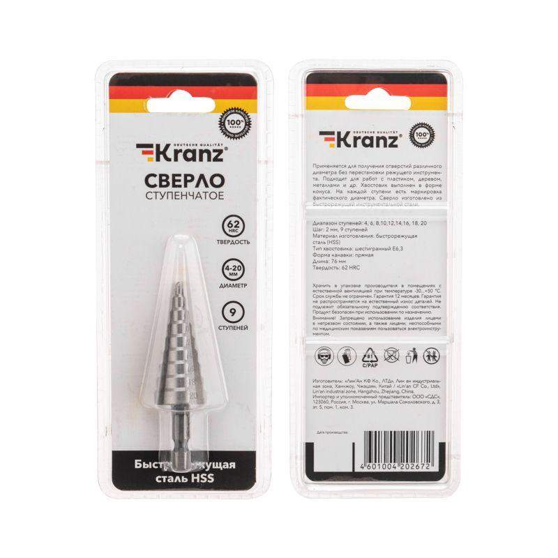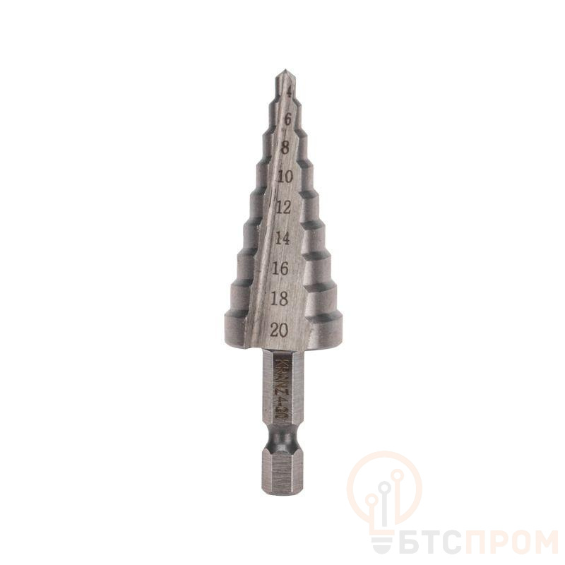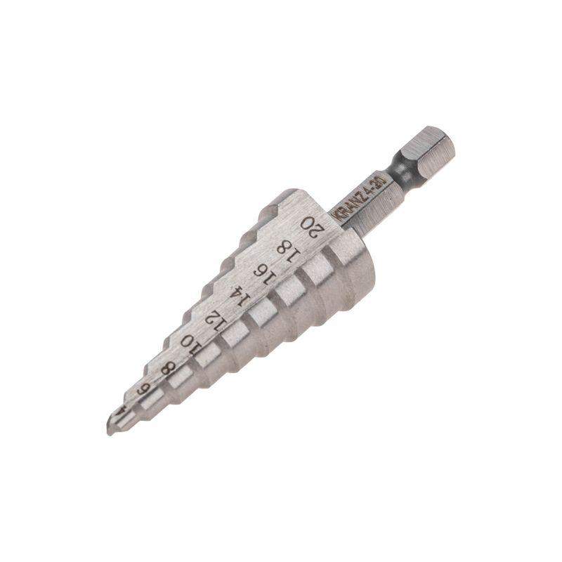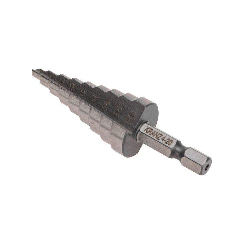 Ступенчатое сверло KRANZ применяется при выполнении монтажно-сборочных работ для сверления отверстий различных диаметров без перестановки режущего инструмента. Применяется в работе с такими материалами, как пластик, дерево, металл и др. Благодаря своей уникальной конструкции изделие заменяет целый набор традиционных спиральных сверл. Использование оснастки позволяет сэкономить время мастера, так как не требует предварительного кернения и сверления. Шестигранный хвостовик Е6,3 обеспечивает надежную фиксацию сверла во всех типах патронов шуруповертов и дрелей. Форма канавки – прямая. На каждой из 9 ступеней сверла нанесена маркировка фактического диаметра. Диапазон ступеней: 4, 6, 8, 10, 12, 14, 16, 18, 20 (шаг 2 мм). Сверло изготовлено из быстрорежущей инструментальной стали (HSS) и обладает высокой прочностью, а также устойчивостью к динамическим нагрузкам и перегреву.