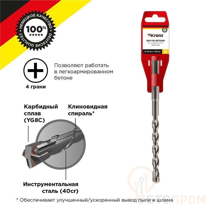 Бур по бетону с крестообразным наконечником KRANZ предназначен для сверления и бурения отверстий в слабоармированном бетоне, граните, кирпичной кладке и камне. Используется при проведении строительных и ремонтных работ. Бур применяется совместно с перфораторами, оснащенными креплением SDS PLUS, которое является стандартным для большинства электроинструментов. Благодаря конструкции со стабилизирующей спиралью, бур сохраняет точное положение в процессе сверления и обеспечивает равномерное распределение ударной нагрузки. Крестовая вставка из карбидного сплава (YG8C) с 4 гранями, расположенная на конце бура, способствует эффективному и быстрому входу в материал, что увеличивает долговечность бура и снижет вероятность его поломки при попадании в арматуру. Материал изготовления тела бура – инструментальная легированная сталь (40cr).