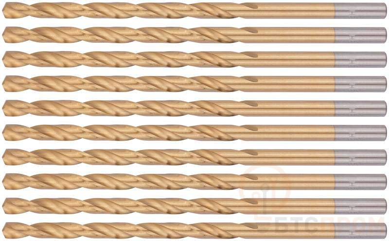 Удлиненные сверла по металлу с титановым покрытием FIT IT предназначены для сверления глубоких отверстий в углеродистых и легированных сталях, серых и ковких чугунах, цветных металлах и пластике. Сверла изготовлены из высококачественной быстрорежущей стали Р9М3, что обеспечивает их долговечность и надежность в использовании. Титановое покрытие увеличивает срок службы оснастки и обеспечивает точное и чистое сверление. Сверла изготовлены методом вышлифовки профиля, что повышает плавность сверления и чистоту готовых отверстий. Крестообразная форма наконечника и угол заточки 135° обеспечивают возможность сверления без предварительного кернения. Сверла имеют высший класс точности А1 и высверливают отверстия с высокоточным диаметром. Цилиндрический хвостовик сверл совместим с патронами большинства дрелей и шуруповертов.