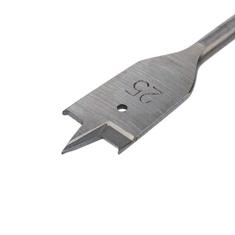 Перовое сверло предназначено для сверления отверстий в древесине мягких и твердых пород, ДВП, ДСП, фанере. Сверло выполнено из закаленной инструментальной стали, которая повышает износостойкость и долговечность инструмента. Состоит из рабочей части и шестигранного хвостовика. В центре рабочей части находится выступ, благодаря которому можно зафиксировать инструмент во время засверливания. С двух сторон от центрального выступа размещены режущие лезвия. Благодаря подрезателям на режущих кромках рабочей части в отверстиях получаются ровные края. Хвостовая часть, выполненная в виде шестигранника, надежно фиксирует сверло в патроне инструмента. Устанавливается на дрель или шуруповерт с высоким крутящим моментом.
