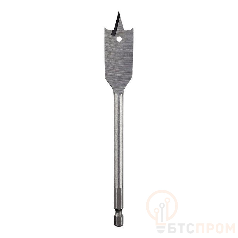 Перовое сверло предназначено для сверления отверстий в древесине мягких и твердых пород, ДВП, ДСП, фанере. Сверло выполнено из закаленной инструментальной стали, которая повышает износостойкость и долговечность инструмента. Состоит из рабочей части и шестигранного хвостовика. В центре рабочей части находится выступ, благодаря которому можно зафиксировать инструмент во время засверливания. С двух сторон от центрального выступа размещены режущие лезвия. Благодаря подрезателям на режущих кромках рабочей части в отверстиях получаются ровные края. Хвостовая часть, выполненная в виде шестигранника, надежно фиксирует сверло в патроне инструмента. Устанавливается на дрель или шуруповерт с высоким крутящим моментом.