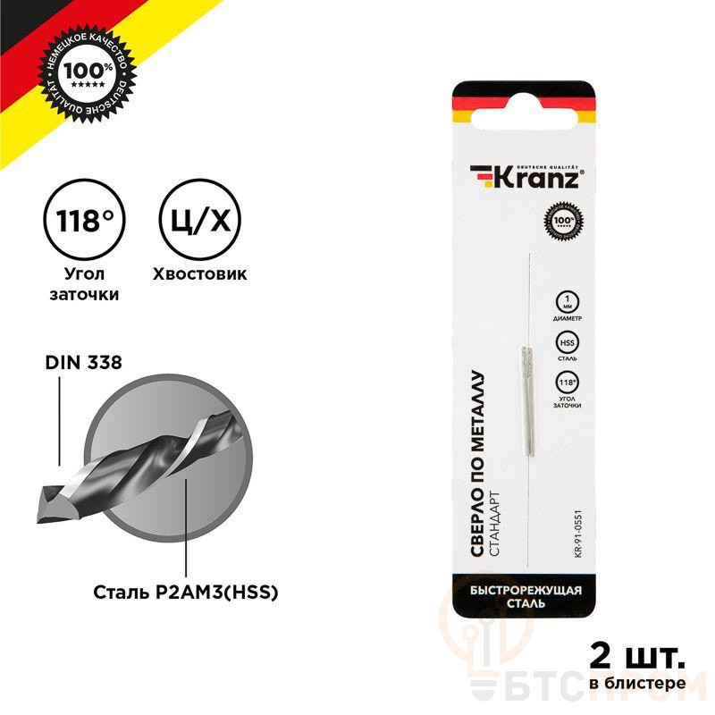 Сверло по металлу 1.0мм HSS DIN 338 (уп.2шт) Kranz KR-91-0551 фото в каталоге от BTSprom.by