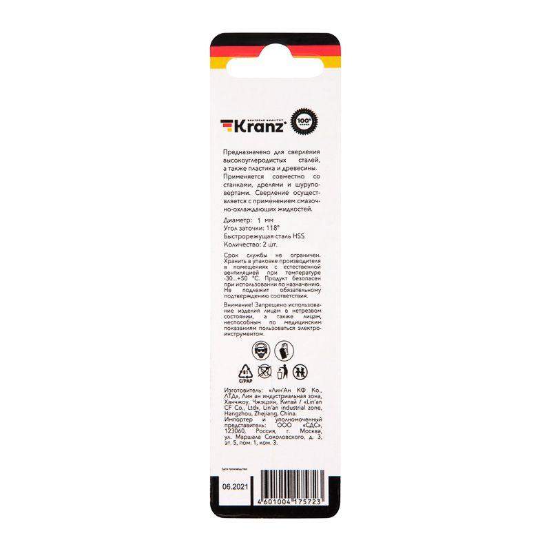–Сверло по металлу 1.0мм HSS DIN 338 (уп.2шт) Kranz KR-91-0551