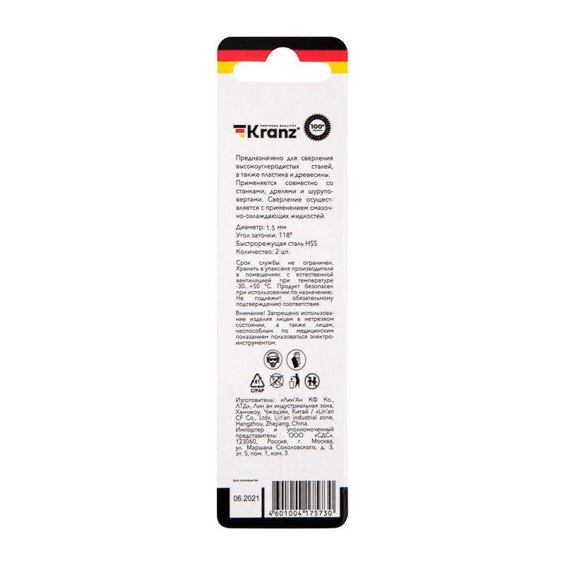 Сверло по металлу 1.5мм HSS DIN 338 (уп.2шт) Kranz KR-91-0552 фото в каталоге от BTSprom.by
