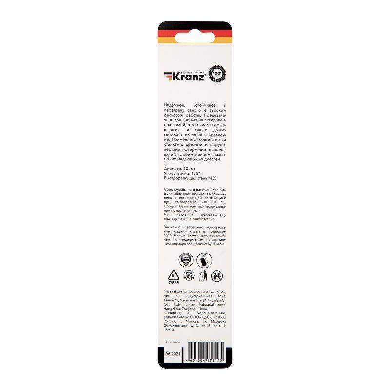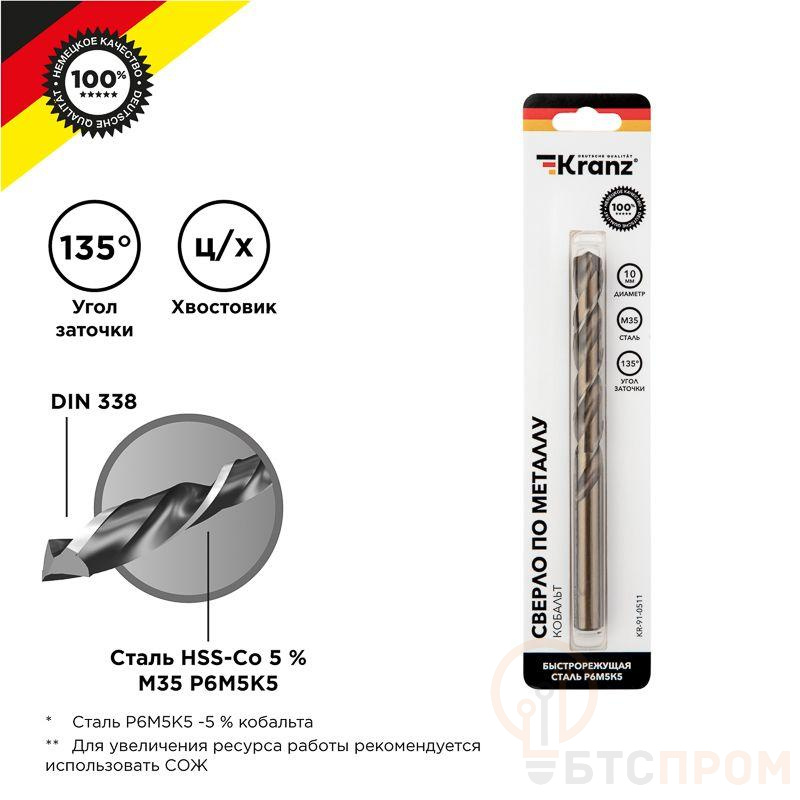 Сверло по металлу KRANZ изготовлено по стандарту DIN 338 и используется для сверления отверстий в таких материалах, как сталь, чугун, нержавеющая сталь, легированные и цветные металлы. Имеет цилиндрический хвостовик, применяется совместно с дрелями, шуруповертами и станками. Изделие выполнено из качественной быстрорежущей стали М35 (Р6М5К5) с добавлением 5% кобальта, что обеспечивает стойкость к перегреву, долгий срок службы и высокую эффективность. Благодаря заточке режущей части под углом 135 градусов достигается более эффективный вход оснастки в материал, что приводит к увеличению ресурса эксплуатации и сокращению износа сверла. Благодяря вышлифованному профилю сверло сохраняет точное положение во время сверления, что гарантирует получение ровных и аккуратных отверстий без трещин и сколов.